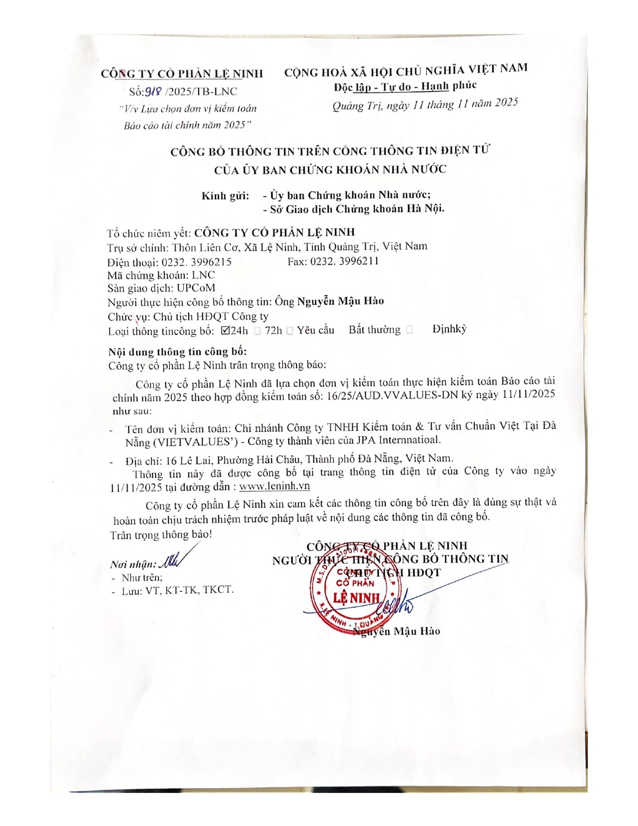 Thông báo lựa chọn đơn vị kiểm toán BCTC năm 2025